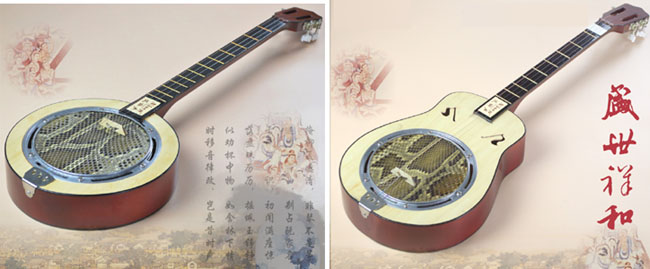 - B. O tipo mais moderno de Qinqin pode parecer uma guitarra (semelhante a um dobro) ou como um banjo. Sempre tem uma pele esticada muitas vezes feita de pele de cobra (pitão). Geralmente têm um braço tipo guitarra (com trastes embutidos em metal) e uma cabeça plana com afinadores do tipo da viola ocidental.