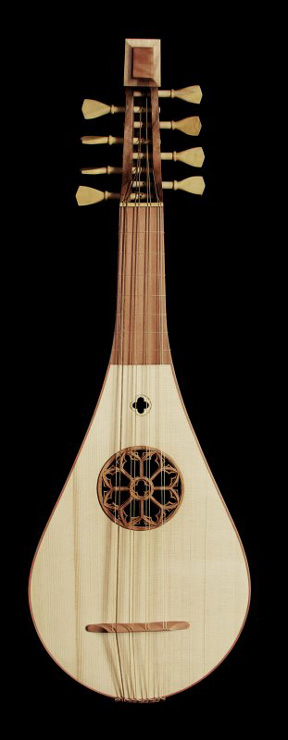 A origem não é consensual mas está a meio caminho entre o alaúde árabe-andaluz e os alaúdes Carolíngios.
