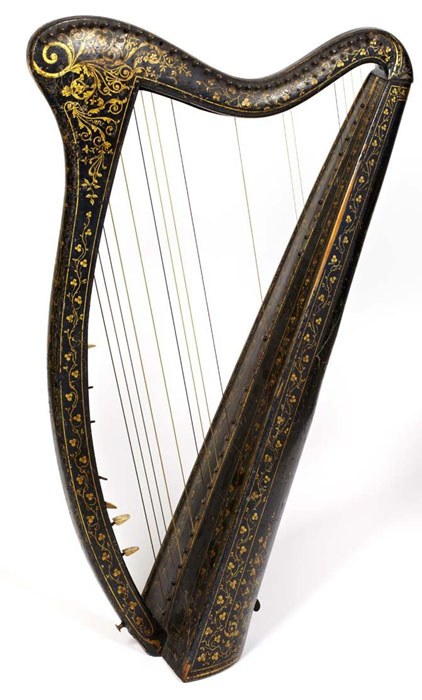 Esta harpa também tinha uma coluna curva e um pescoço substancial, flanqueado com grossas faixas de bronze. As cordas, geralmente tocadas com as unhas, produziam um som de toque brilhante.