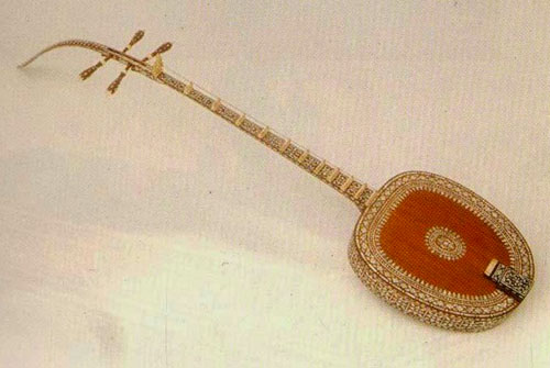 O braço e a cabeça são feitos de uma única peça de madeira e colados ao corpo através de uma junta . A cabeça se estende numa curva muito longa (plana) para trás; este acessório pode ser retirado e é altamente decorado com madeira escura e plástico branco (aspeto marfim). Os 13 trastes (numa escala regular de sete a uma oitava) são pedaços de plástico branco, colados na frente plana do braço.