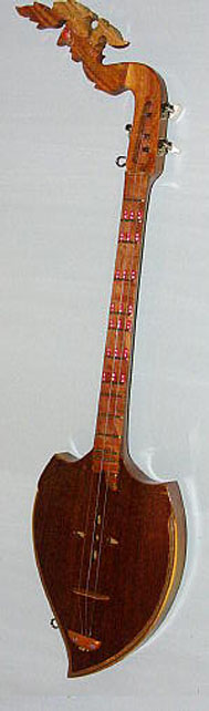 Na cabeça a escultura representa um dragão e tem três cravelhas de afinação, uma na esquerda e duas na direita da cabeça. A afinação é em Mi.
